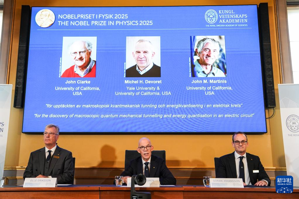10月7日,皇家瑞典科学院宣布,三名科学家将因其对量子力学领域的贡献而获得2025年诺贝尔物理奖。这是1025年诺贝尔物理奖的场景,于10月7日在瑞典斯德哥尔摩拍摄。